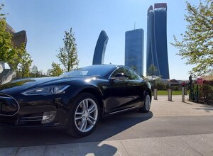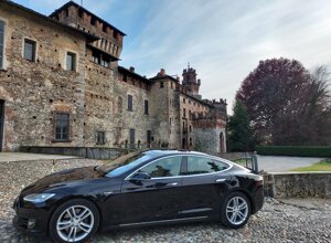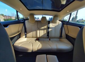 Tesla Model S, auto completamente elettrica. Sedili in pelle beige, tetto in vetro panoramico. Massimo comfort.
